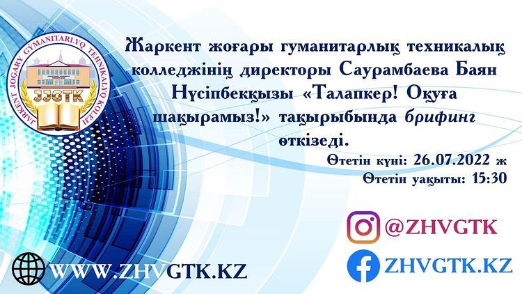 Director of the Zharkent Higher Humanitarian and Technical College Saurambayeva Bayan Nusipbekovna with applicants for 2022-2023 “Applicant! “We invite you to study” a briefing was held. Applicants were familiarized with pedagogical specialties by order of the Ministry of Education and Science of the Republic of Kazakhstan dated October 18, 2018 No. 578 “On approval of standard principles for admission to educational organizations implementing educational programs of technical and vocational, higher education.” Exhaustive answers were given to questions.
