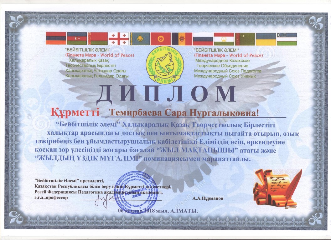 «Бейбітшілік әлемі» Халықаралық бірлестігі халықтар арасындағы достық пен ынтымақтастықты нығайту жолында озық тәжірибесі мен ұйымдастырушылық қабілетін Еліміздің өсіп, өркендеуіне зор үлес қосқан Жаркент гуманитарлық-техникалық колледж директоры Темирбаева Сара Нургалыкқызы «Жыл мақтанышы» атағына ие болды.