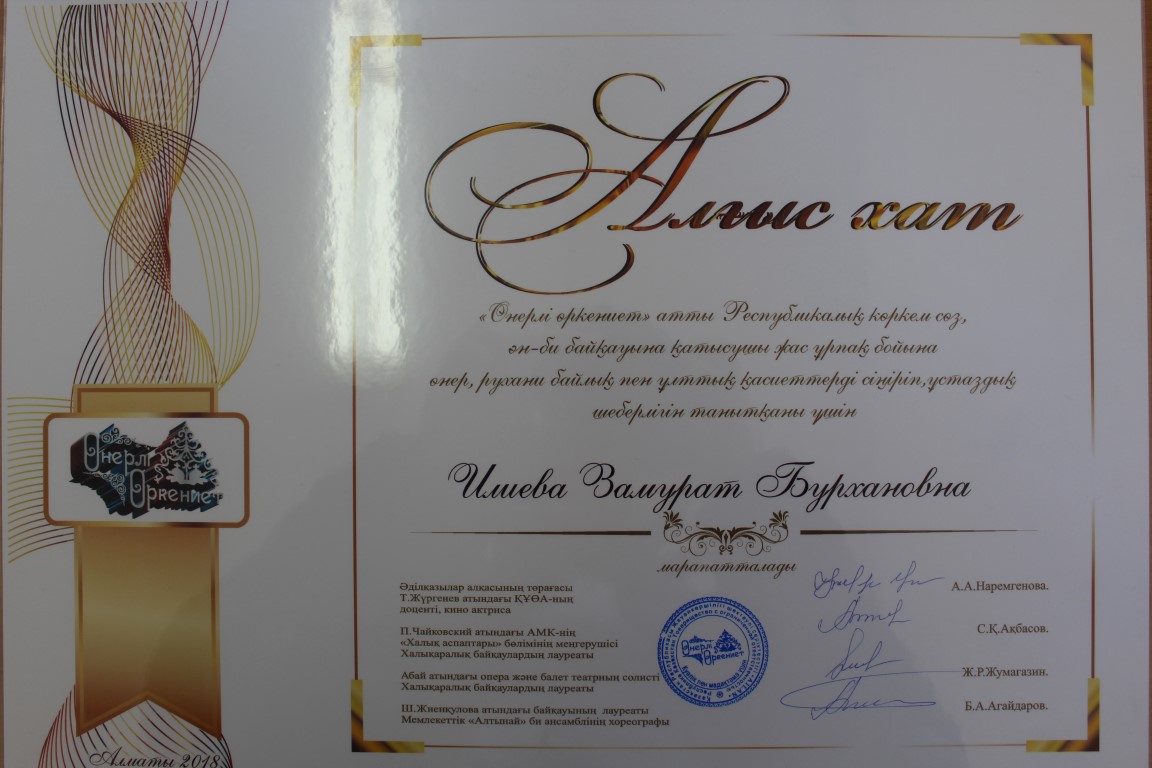 «Өнерлі өркениет» атты Республикалық ән-би байқауына қатысып, «Аспапта ойнау» номинациясы бойынша жүлделі І орынды Сүлеймен Олжас, ІІ орынды Исрайлов Мадияр иеленді. Жетекшісі Илиева Замурат Бухановна.