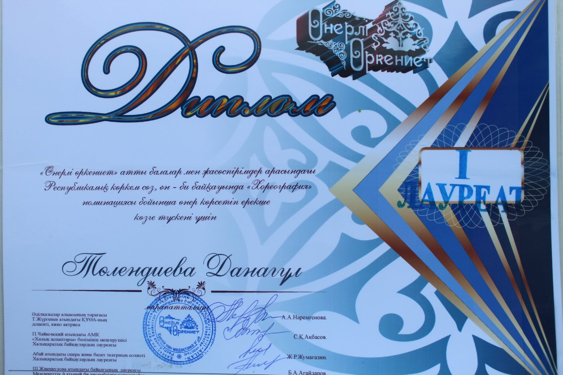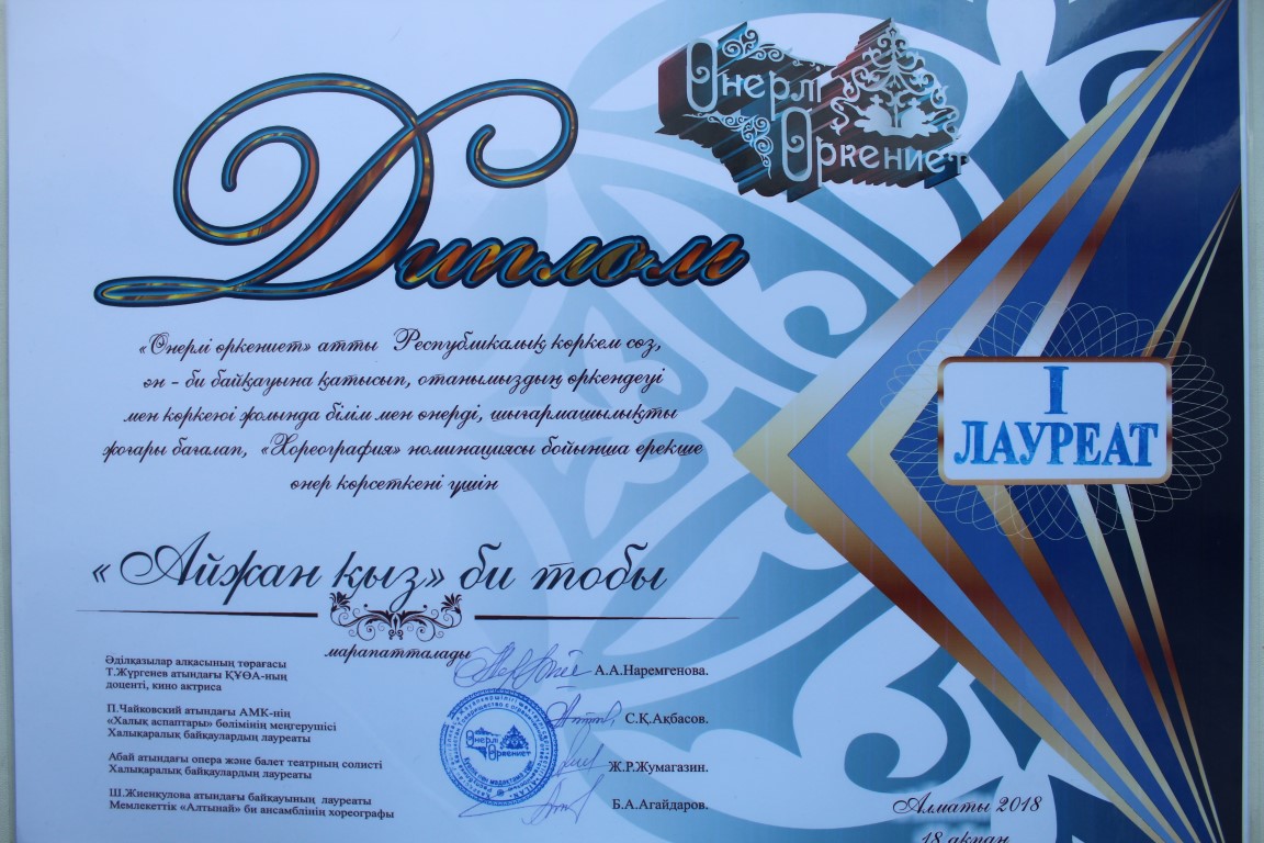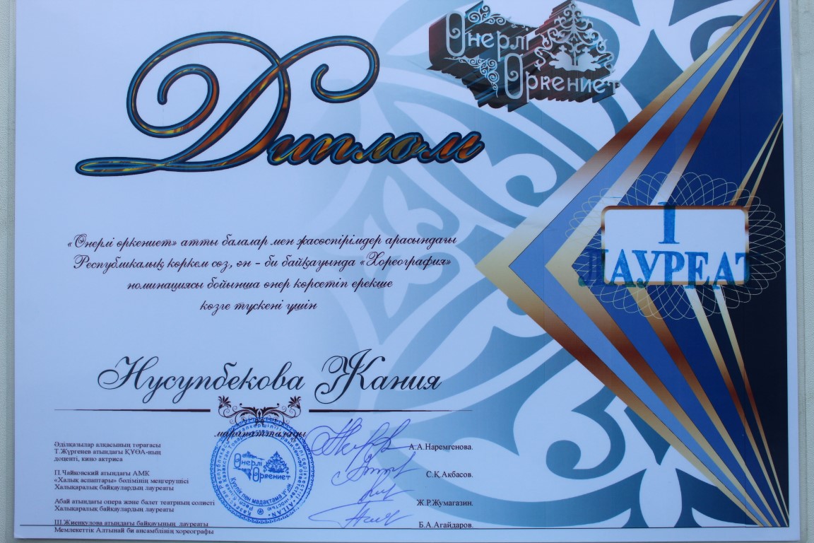 «ӨНЕРЛІ ӨРКЕНИЕТ» АТТЫ РЕСПУБЛИКАЛЫҚ ӘН-БИ БАЙҚАУЫНА ҚАТЫСЫП, «ХОРЕОГРАФИЯ» НОМИНАЦИЯСЫ БОЙЫНША ЖҮЛДЕЛІ І ОРЫНДЫ ЖГТК СТУДЕНТТІ ИЕЛЕНДІ
