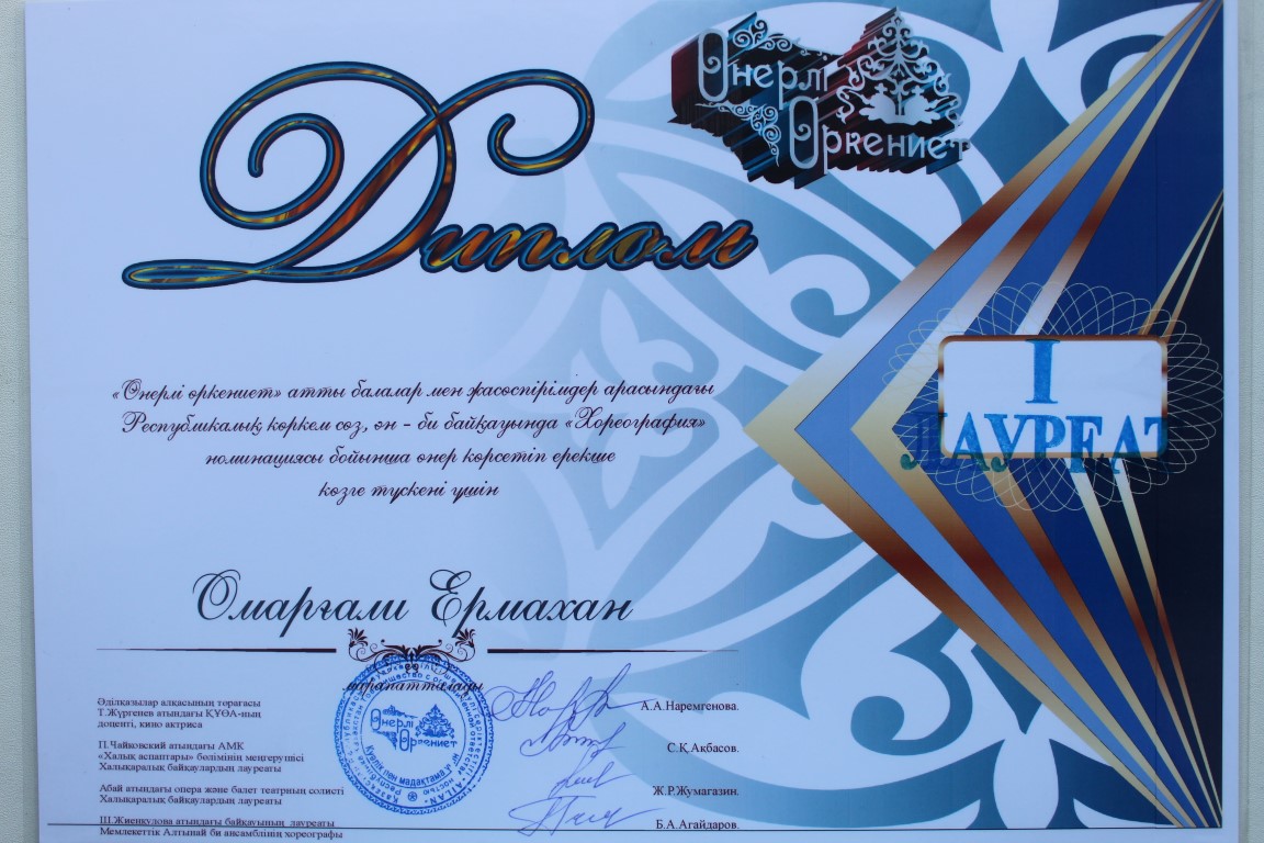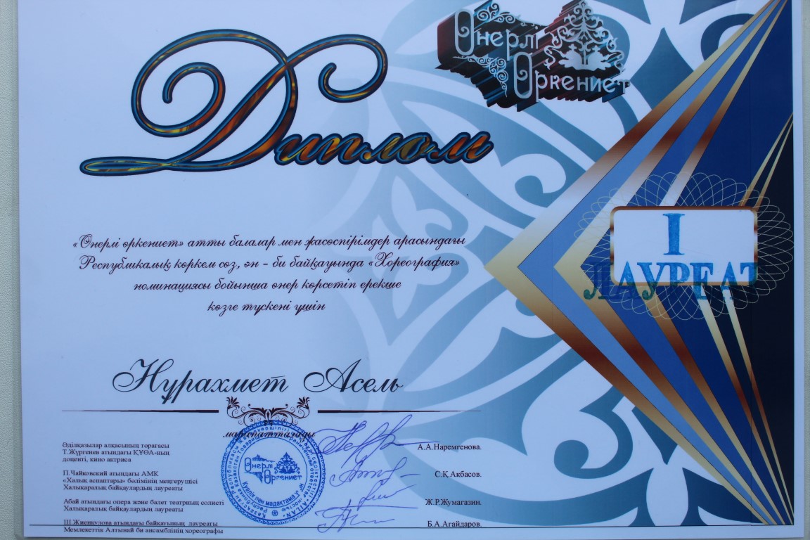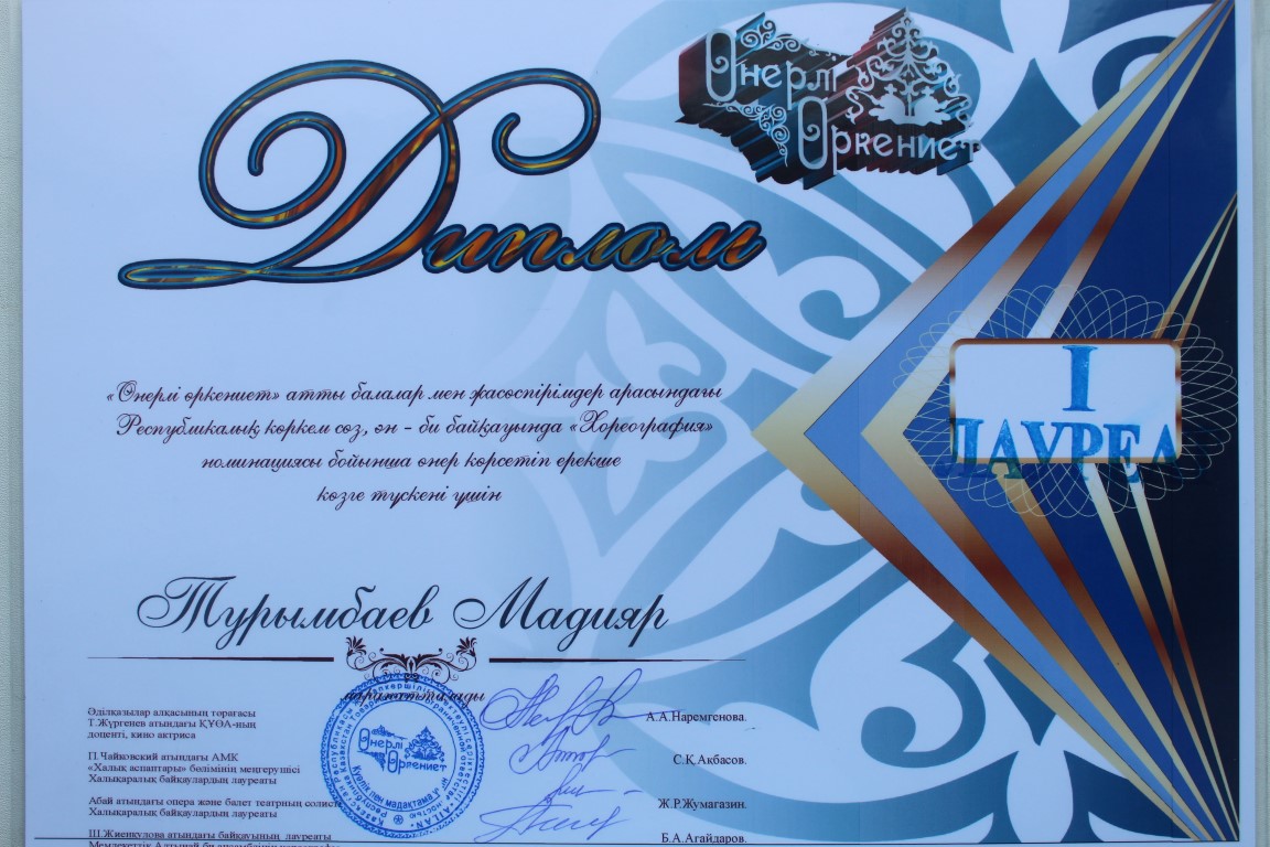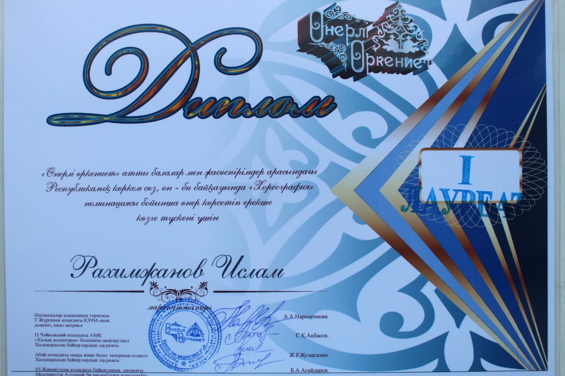 «ӨНЕРЛІ ӨРКЕНИЕТ» АТТЫ РЕСПУБЛИКАЛЫҚ ӘН-БИ БАЙҚАУЫНА ҚАТЫСЫП, «ХОРЕОГРАФИЯ» НОМИНАЦИЯСЫ БОЙЫНША ЖҮЛДЕЛІ І ОРЫНДЫ ЖГТК СТУДЕНТТІ ИЕЛЕНДІ