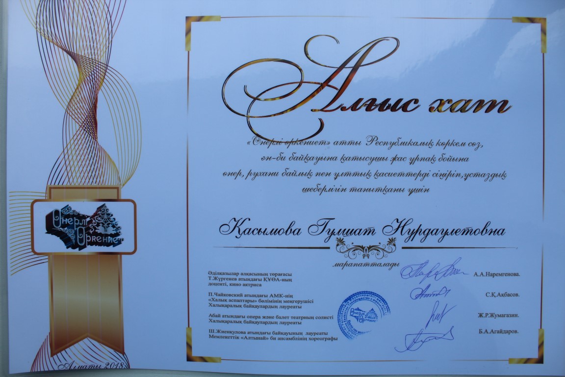 «Өнерлі өркениет» атты Республикалық ән-би байқауына қатысып, «Хореография» номинациясы бойынша жүлделі І орынды «Айжан қыз» бишілер тобы иеленді. Жетекшісі Касымова Гулшат Нурдаулетқызы.