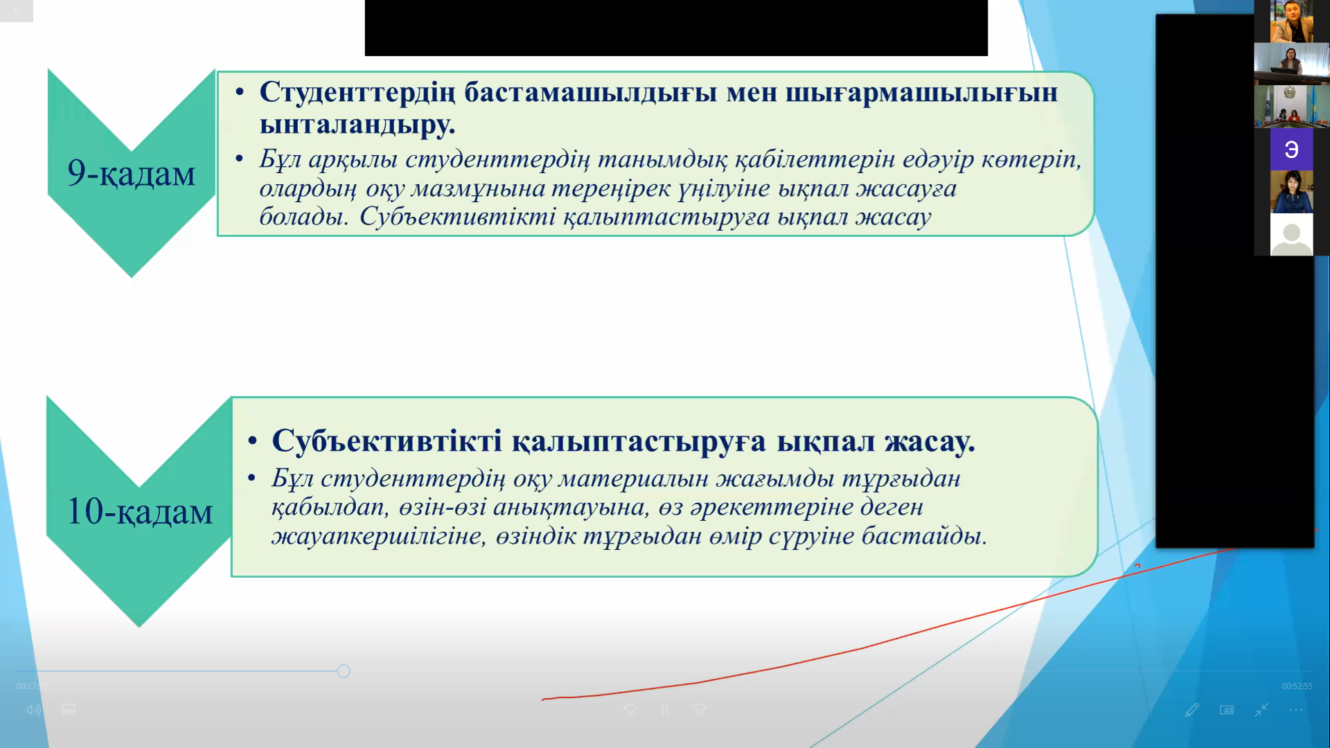 К. Құрабалдиева қолданбалы бакалавриат бағдарламасы бойынша міндетті компоненттерге сәйкес пәндерге жасалатын силлабус үлгісімен таныстырылым жасап, силлабусты жасау әзірлемесіне әдістемелік нұсқау ұсынды.Вебинардың тәжірибелік алаңында Ж. Мусин атындағы Көкшетау жоғары қазақ педагогикалық колледжінің оқытушылары С.Әмірова «М.Монтессори технологиясының сенсорика аймағын пайдалану мүмкіндіктері» тақырыбында дидактикалық ойындарға қажетті оқу құралдарымен таныстыра отырып, мектепке дейінгі оқыту және тәрбиелеу мамандығы бойынша балабақшаларда жүргізілетін барлық білім беру салаларына қолданып, оқу