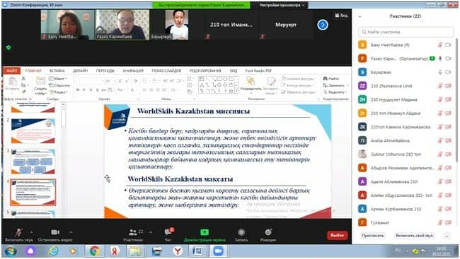 «Кәсіби білім беру жүйесін WorldSkills стандартына енгізуде педагогикалық құзіреттіліктерді жүзеге асыру» тақырыбында «Дене тәрбиесі және спорт» мамандығы бойынша 207-топқа, «Мектепке дейінгі тәрбие және оқыту қолданбалы бакалавры» бойынша 209-топқа, «Бастауыш білім беру қолданбалы бакалавры» мамандығы бойынша 210-топқа, «Бастауыш білім беру» мамандығы бойынша 301, 302, 303-топтарға, «Мектепке дейінгі тәрбие және оқыту» бойынша 307-топқа, «Негізгі орта білім» мамандығы бойынша 306-топ студенттеріне WorldSkills қозғалысын насихаттау жұмыстары жүргізілді.