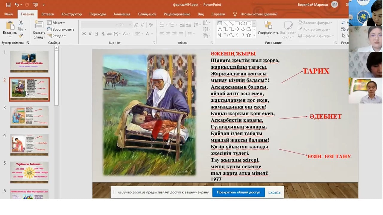 Облыстық білім беруді дамыту оқу-әдістемелік орталығының ұйымдастырылуымен наурыздың бесі Республикалық «Фариза Оңғарсынова өлеңдерінің идеялары» тақырыбында Жаркент жоғары гуманитарлық-техникалық, Ж.Мусин атындағы Көкшетау жоғары қазақ педагогикалық және М.Мәметова атындағы Қызылорда жоғары педагогикалық колледждерімен онлайн кіріктірілген сабақта іс-тәжірибесімен оқытушылар,студенттер арасында іс-тәжірибе алмасты.