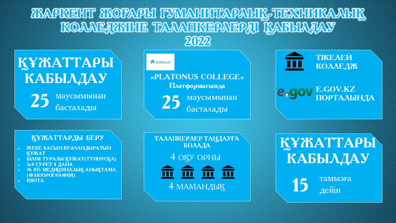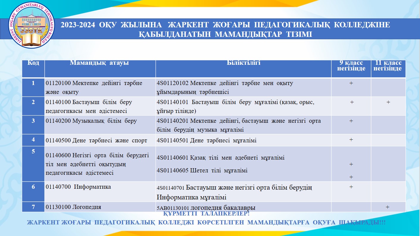 Жаркент жоғары гуманитарлық-техникалық колледжінің директоры Саурамбаева Баян Нүсіпбекқызы 2022-2023 жылына қабылданатын талапкерлермен «Талапкер! Оқуға шақырамыз» атты брифинг өткізді. Талапкерлерді «Техникалық және кәсіптік, орта білімнен кейінгі білімнің білім беру бағдарламаларын іске асыратын білім беру ұйымдарына оқуға қабылдаудың үлгілік қағидаларын бекіту туралы» Қазақстан Республикасы Білім және ғылым министірінің 2018 жылғы 18 қазандағы №578 бұйрығына өзгерістер мен толықтыру енгізу туралы бұйрғындағы педагогикалық мамандықтарға қатыстыталапкерлермен таныстырылды. Қойылған сұрақтарға толығымен жауап берілді.
