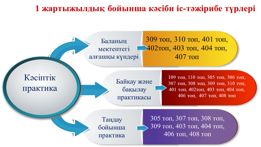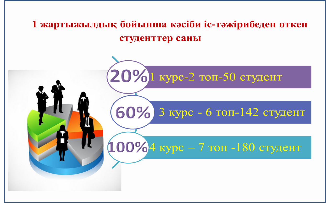 1 курстар - 2 топ, барлығы 50 студент жалпы 1 курс студенттернің 20 %, 3 курстар - 6 топ, барлығы 142 студент жалпы 3 курс студенттерінің 60 %, 4 курстар - 7 топ, барлығы 180 студент 4 курс студенттерінің 100 % кәсіби іс-тәжірибеден өтті.