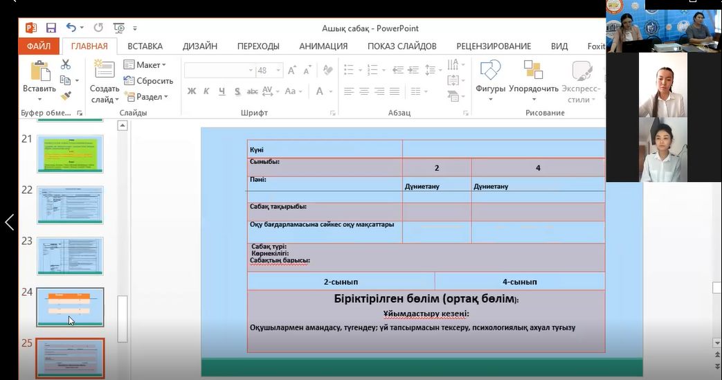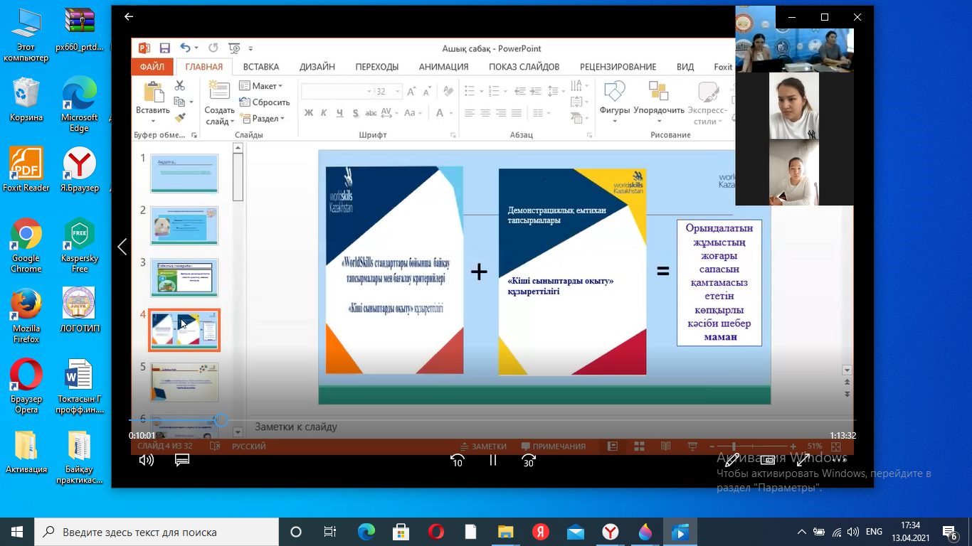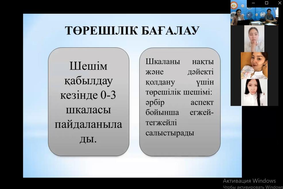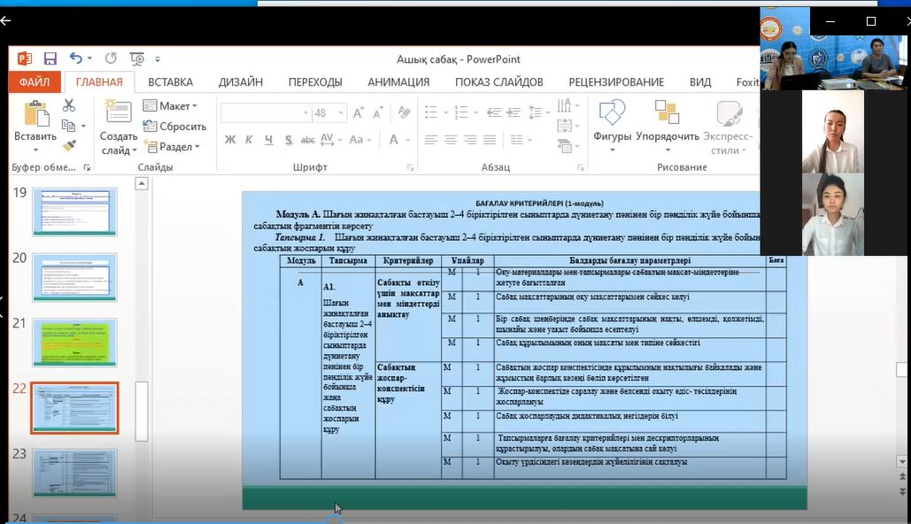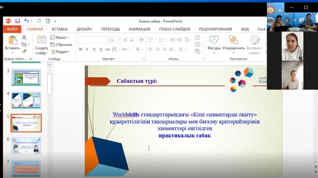 В жаркентском высшем гуманитарно-техническом колледже в ходе декады ПЦК педагогики и психологии были проведены многочисленные методические работы, а также открытые уроки. 12 апреля в приложении ZOОM преподаватель педагогики колледжа, магистр педагогических наук Асанова Нургуль Сейткамаловна провела открытый урок по организации учебно-воспитательного процесса в малокомплектной школе со студентами группы ЗК-17, обучающимися по специальности 0105000 «учитель начального образования». Тема урока "планирование урока познания мира в малокомплектной начальной школе". Тип урока практическое занятие в стандартах Worldskills включены задания компетенции «обучение младших классов» и критерии оценивания. Общее содержание урока, начатого эпиграфом "к умным навыкам с путеводителем в будущее", было увязано с обновлением современного образования и науки, достигнутыми успехами, для чего преподаватель на своем уроке продемонстрировал видеоролики, в которых были продемонстрированы грандиозные работы стран с развитой наукой и техникой, а по содержанию - «P.S (постскриптум-мысль после сказанного)». Критерии оценивания выполнения практического задания» составление плана урока по познанию мира по единой системе в начальных 2-4 классах " разработаны в соответствии со стандартами WSK. Для проведения оценки через критерии оценивания 1,2 заданий по модулю а практического этапа в качестве оценочных экспертов были специально выбраны студенты группы, конкурсанты регионального чемпионата WS 2020 года: Адылгазы А., Турганбек Б. Эксперты провели объективную (измеримую) и субъективную (судейскую) оценку заданий модуля по каждому аспекту и заменили итоговые итоговые баллы на оценки по 4-балльной системе. LearningApps.org в приложении эффективно использовались мультимедийные интерактивные виды заданий. На уроке " КАМТ (сила. Слабость. Возможность, риск) была применена форма обратной связи, и студенты могли поделиться своими мнениями и вопросами в приложении ZOOM, в сетях WhatsApp.