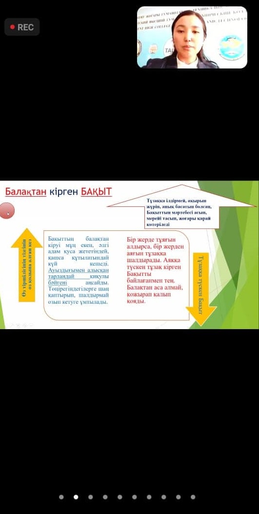 На открытой экспериментальной площадке магистр наук казахского языка и литературы, преподаватель Жаркентского высшего гуманитарно-технического колледжа Оразхан Алмагуль Сембаевна поделилась опытом работы на тему «Бахыт Балакан въезжает и приземляется». А. Сейдимбек: «впервые, когда человек проявляет свою человеческую личность, прижимает лапу к Земле, лбом к Солнцу и берет в свои руки бразды своего существования,счастье приходит от ребенка этого человека» - преподаватель сумел донести до коллег, как можно развивать, совершенствовать, ценить и удерживать свое человеческое счастье. К примеру, когда счастье достигает пояса, то оно заканчивается разрушительной силой, как если бы оно прерывало талию, сгибало колени, поэтому крепкая талия на одну голову, крепкая на тысячу веков, призвала бы подрастающее поколение служить народу.