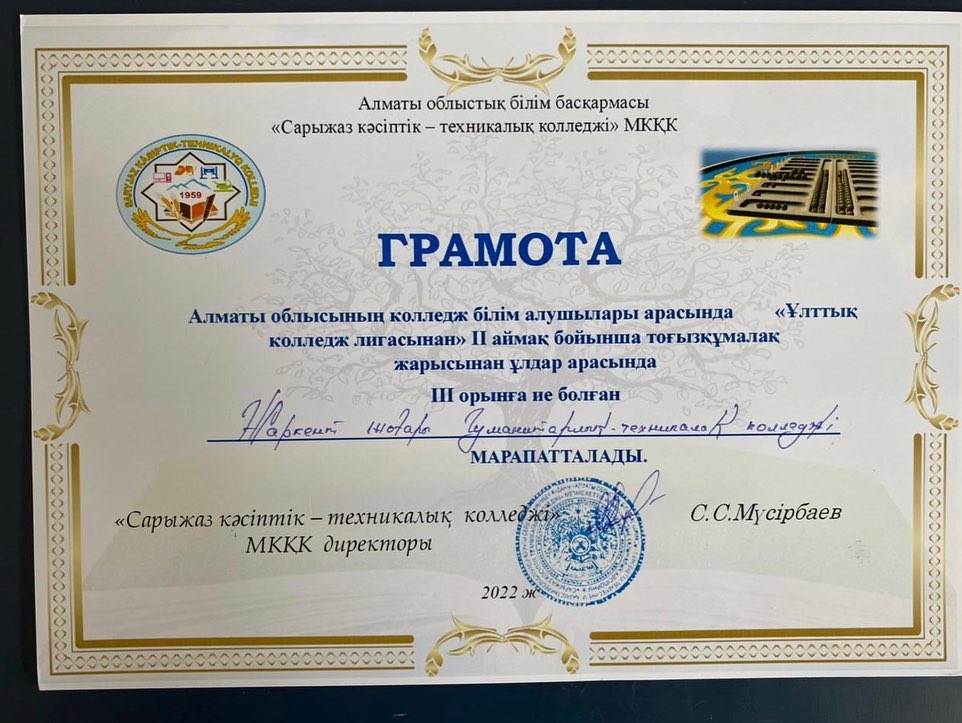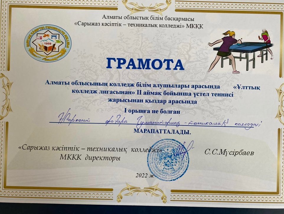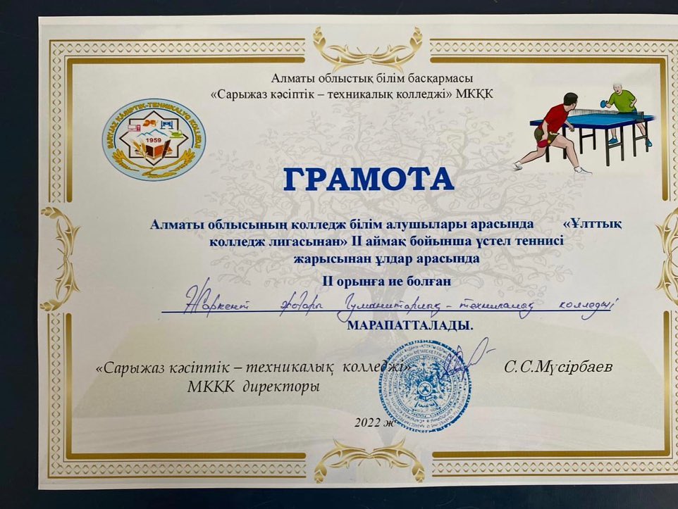 В соревнованиях по настольному теннису и тогызкумалаку II регионального этапа "Национальной лиги колледжей" среди студентов колледжей Алматинской области команды юношей и девушек Жаркентского высшего гуманитарно - технического колледжа заняли 1-2-3 места. Поздравляем!!!