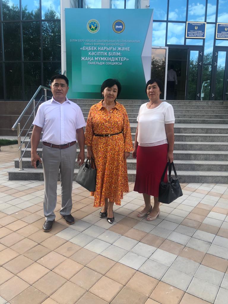 В рамках республиканского августовского форума лидеров образования Панельная секция» рынок труда и профессиональное образование: новые возможности " прошла в Таразе. На площадке обмена опытом присутствовали директор Жаркентского высшего гуманитарно-технического колледжа Саурамбаева Баян Нусипбековна первой категории, заместитель директора по информационной работе второй категории Сагат Болатебулан Болатович, заместитель директора по научно-методической работе первой категории Курабалдиева Клара Бавашевна.