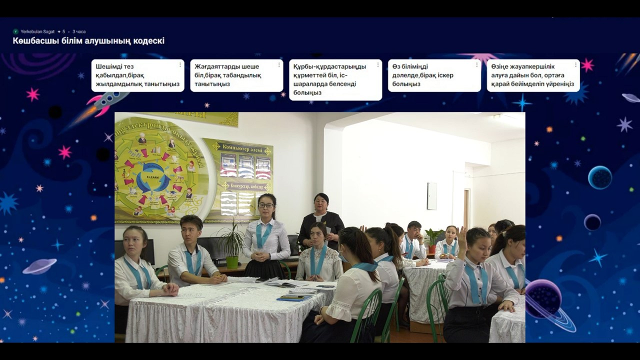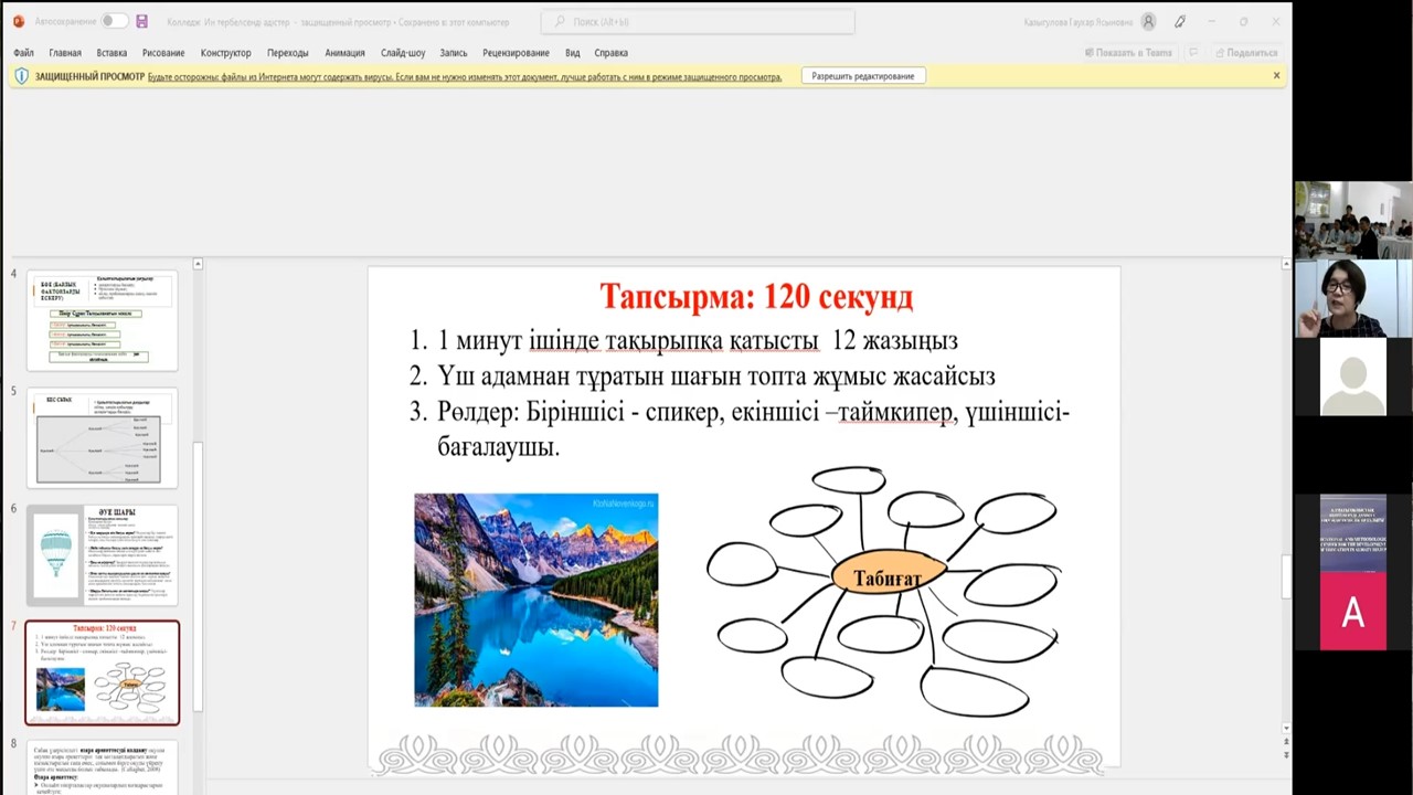 Ардак Калибековной были эффективно использованы на виртуальной панели "Padlet" методы «Ручка", "Концептуальная карта», «Визуальные доказательства» и умело продемонстрирована работа приложения Спиннер Рондем на сервере Flippity.