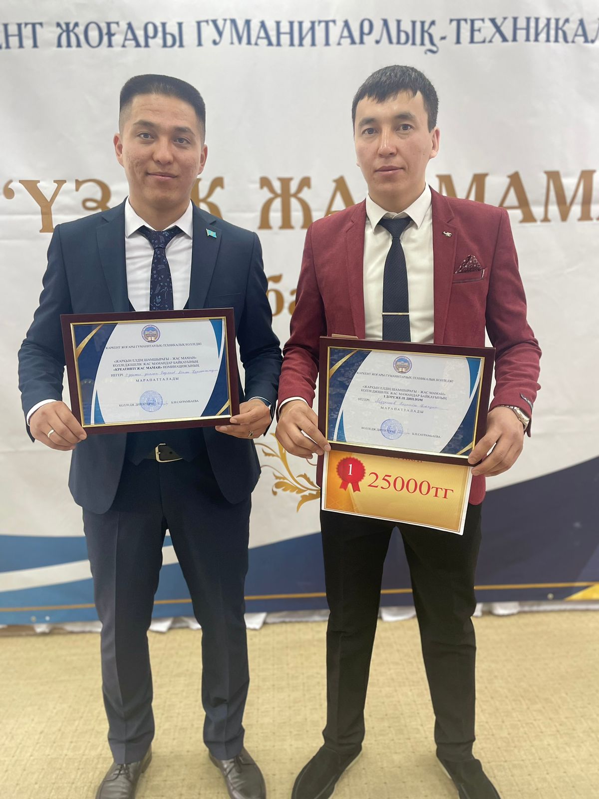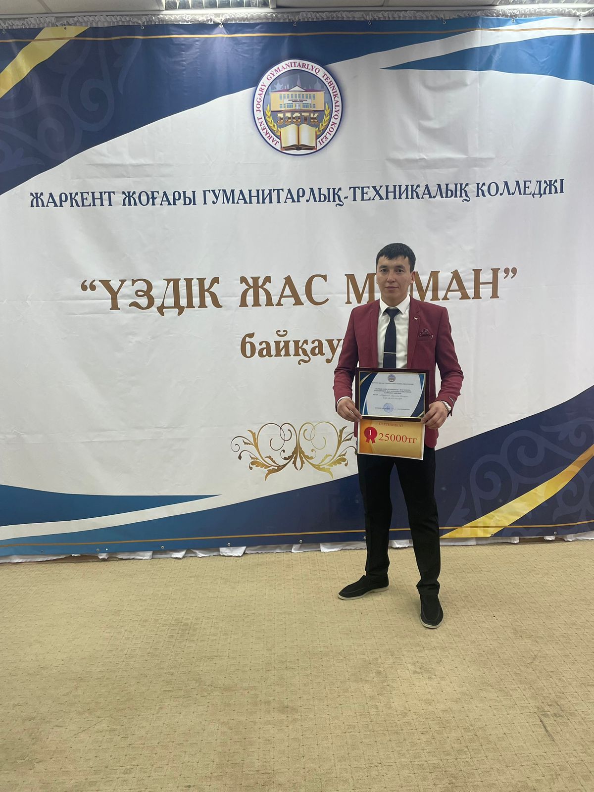 "Квалифицированный специалист-опора страны" (ситуационные вопросы). По итогам конкурса преподаватель физической культуры Мукашов Б. У. награжден Дипломом I степени, сертификатом 25000 тенге, преподаватель английского языка Абдрасул Ж. К. дипломом II степени и сертификатом 15000 тенге, преподаватель физической культуры Даулетов А. К., преподаватель педагогики Абдуллаев Д. Дипломом III степени и сертификатом 10000 тенге награжден. Наши молодые специалисты-участники конкурса получили благодарственные письма в номинации.